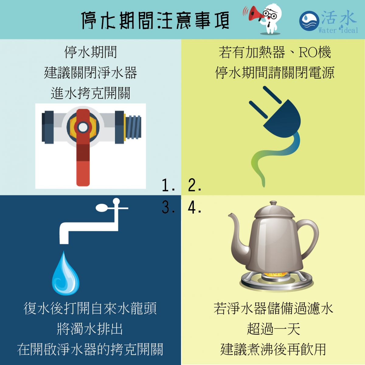 停水期間應特別注意飲水衛生,務必飲用煮沸的開水或市售瓶裝水。