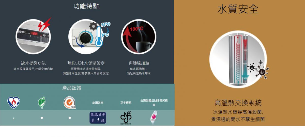 | 缺水提醒功能 無段式冰水保溫設定 再沸騰加熱 |