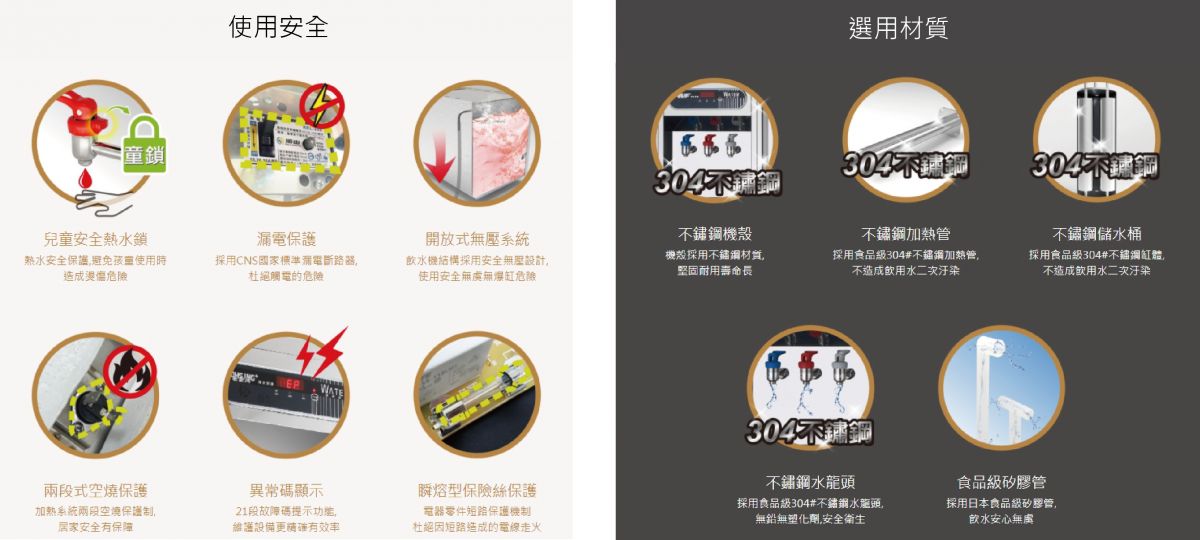 | 兒童安全熱水鎖 漏電保護/漏水偵測 瞬熔型保險絲保護 開放式無壓系統 兩段式空燒保護 |