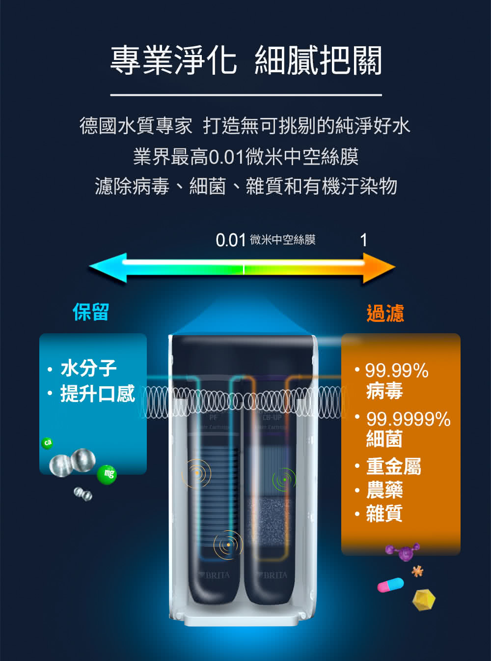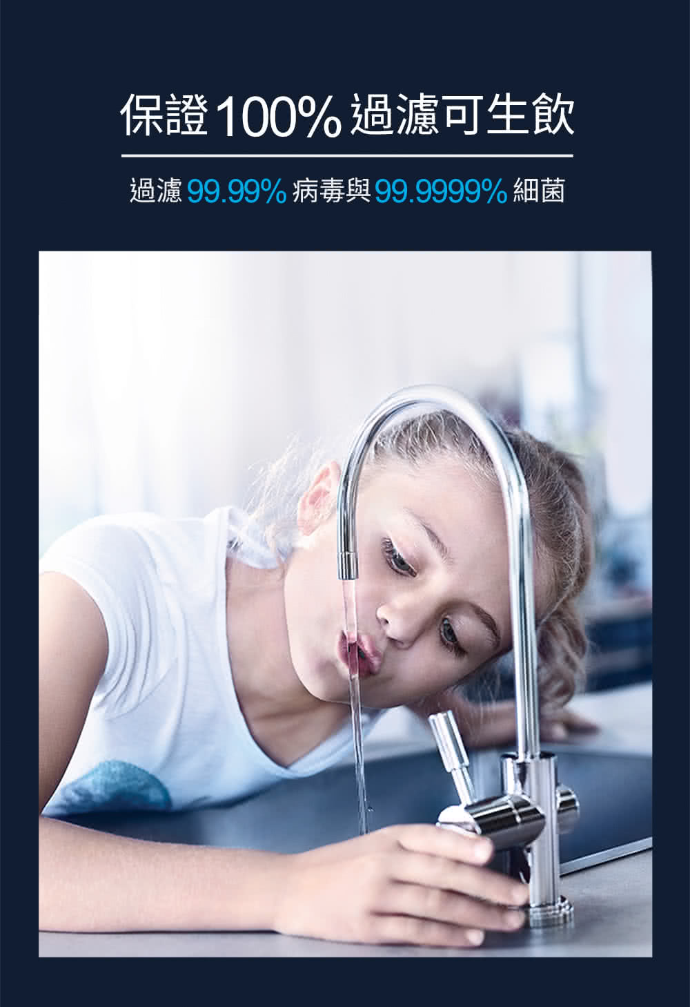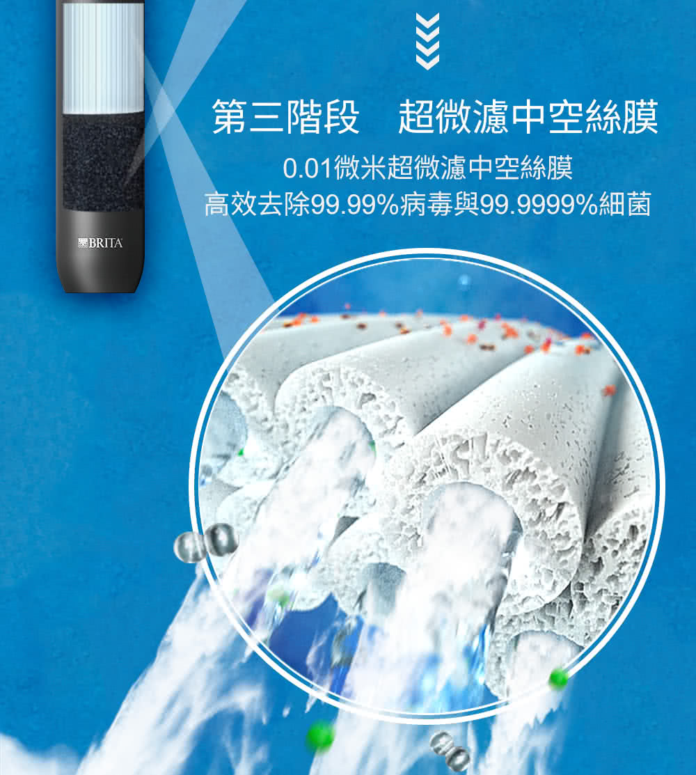 ◎ 孔徑0.01/0.1微米的超微濾中空絲膜,可過濾最細小的汙染物,例如99.9999%的細菌與99.99%的病毒(V9)
