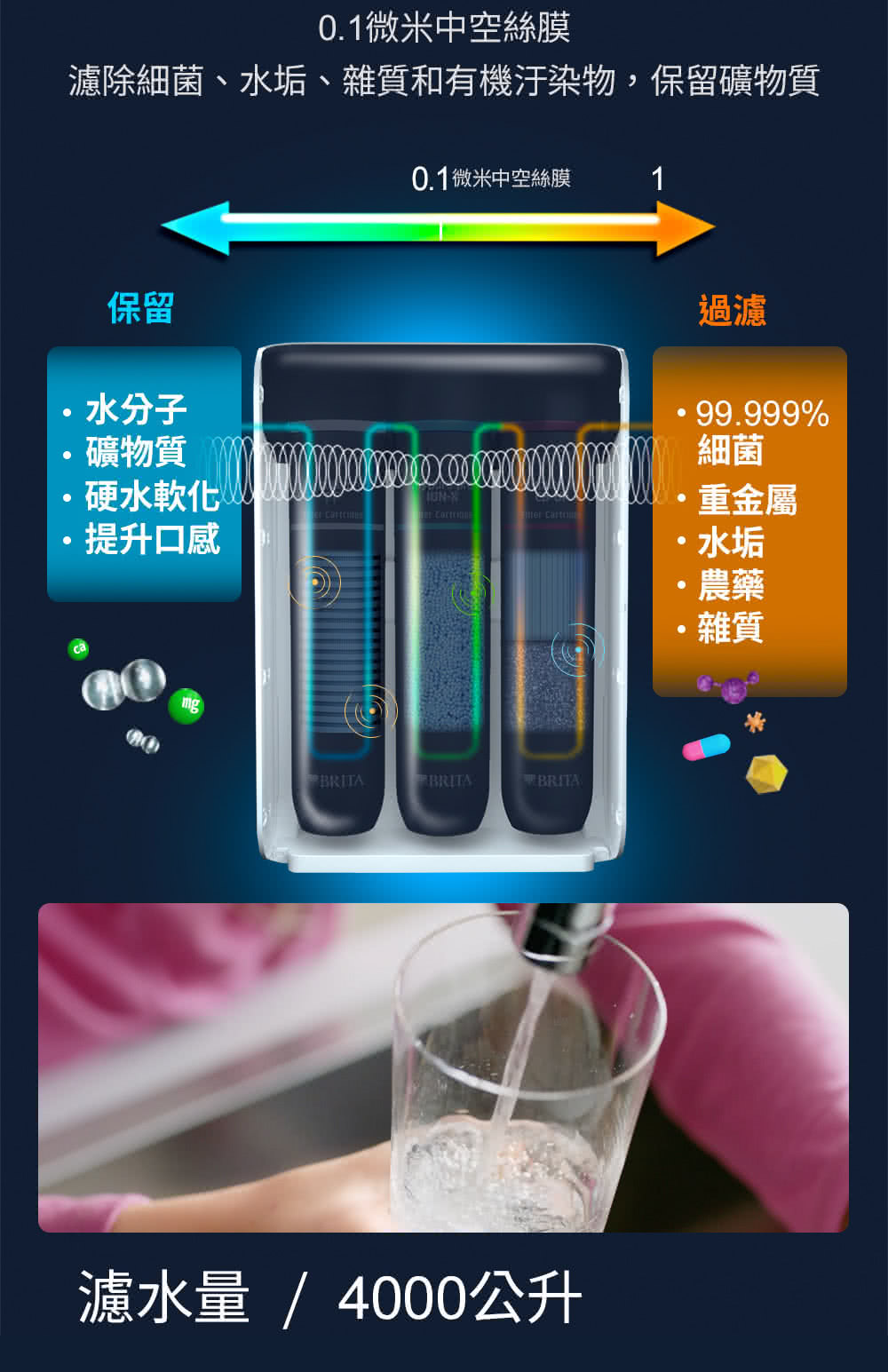 ◎ 孔徑0.01/0.1微米的超微濾中空絲膜,可過濾最細小的汙染物,例如99.9999%的細菌與99.99%的病毒(X9)