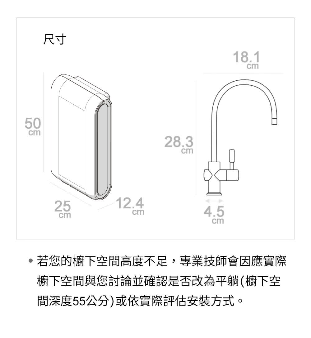 •原水水壓只少須有(1.5kg/cm)的壓力,若水壓太低,需自費裝加壓馬達提高水壓<安裝加壓馬達費用需另計>