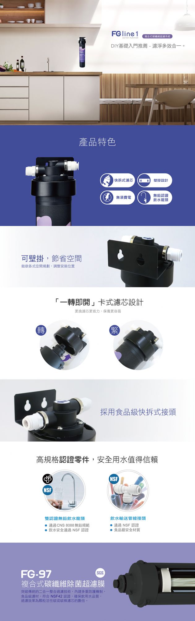 單道全淨化,內建多重防護機制,食品級濾材,符合NSF42認證,確保安全飲用水品質