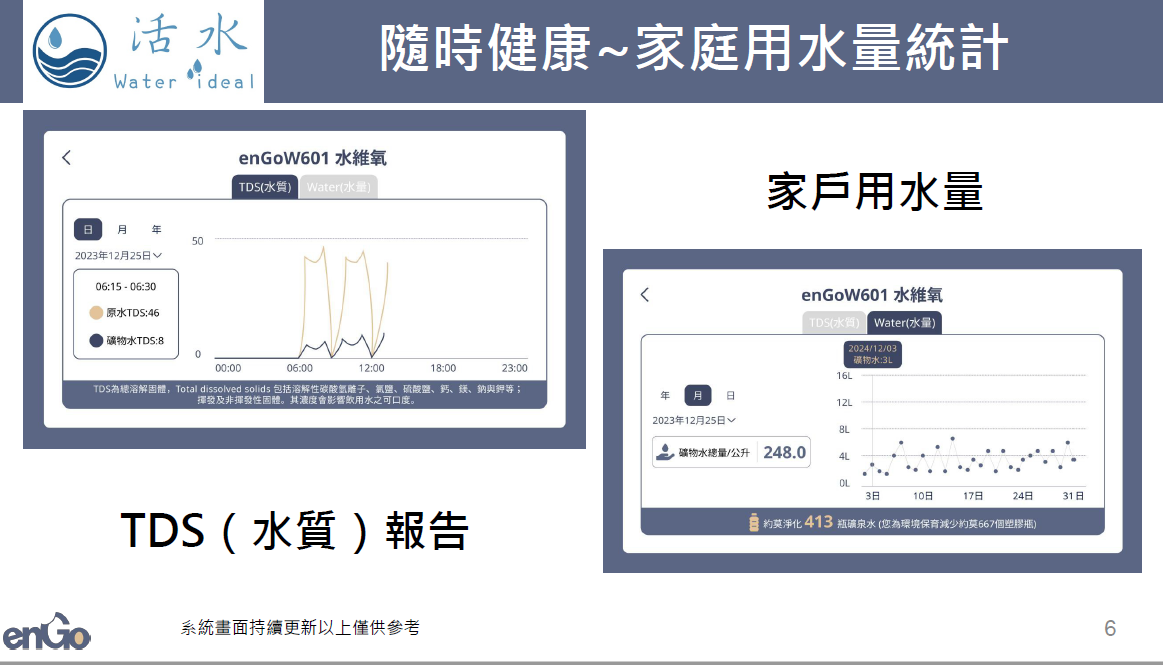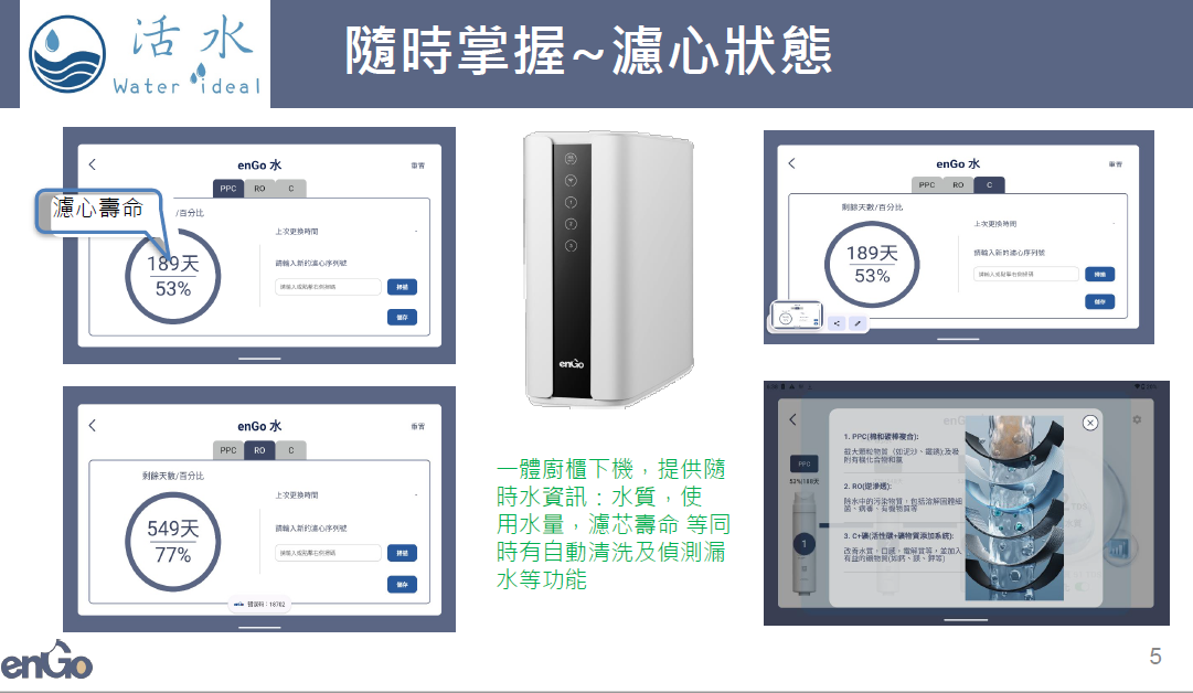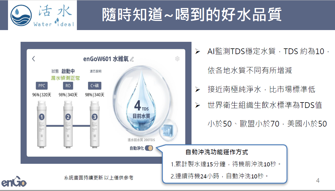 智能水維氧: 內建TDS,透過AI監控水質,提供即時機器資訊(例如飲水量關注、水質、⽤水量、濾芯壽命),故障排除及⾃動通報機體服務需求。