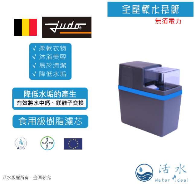 Delta軟水機無需用電,整體控制基於用水流量,而且鹽耗和水耗更少,更有利於環保
