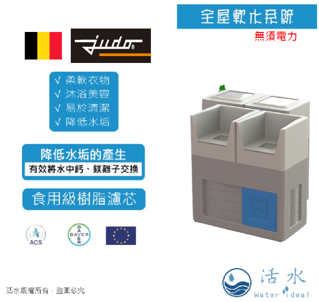 Delta軟水機無需用電,整體控制基於用水流量,而且鹽耗和水耗更少,更有利於環保