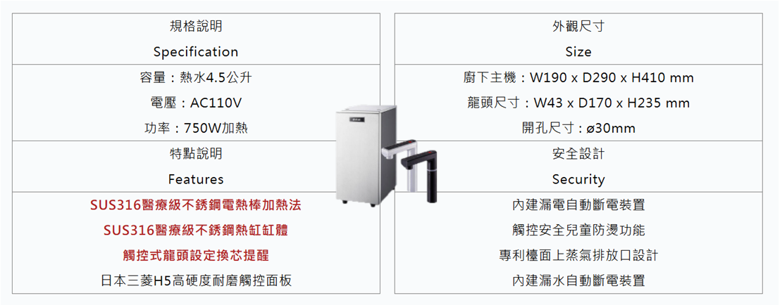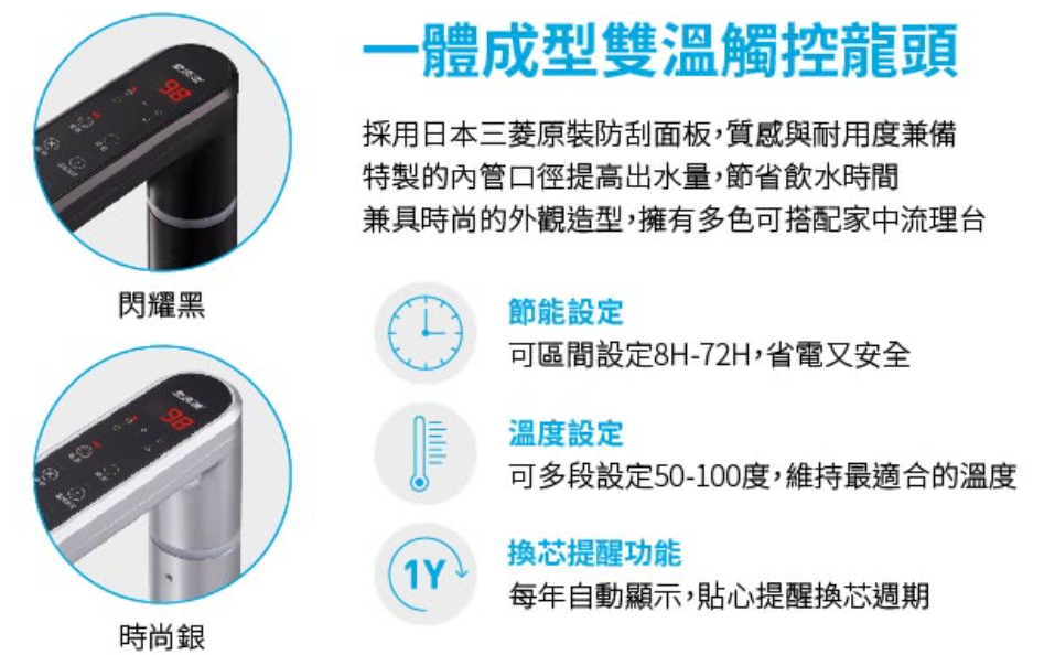 ◎ 一體成型雙溫觸控式龍頭、可設定換芯提醒