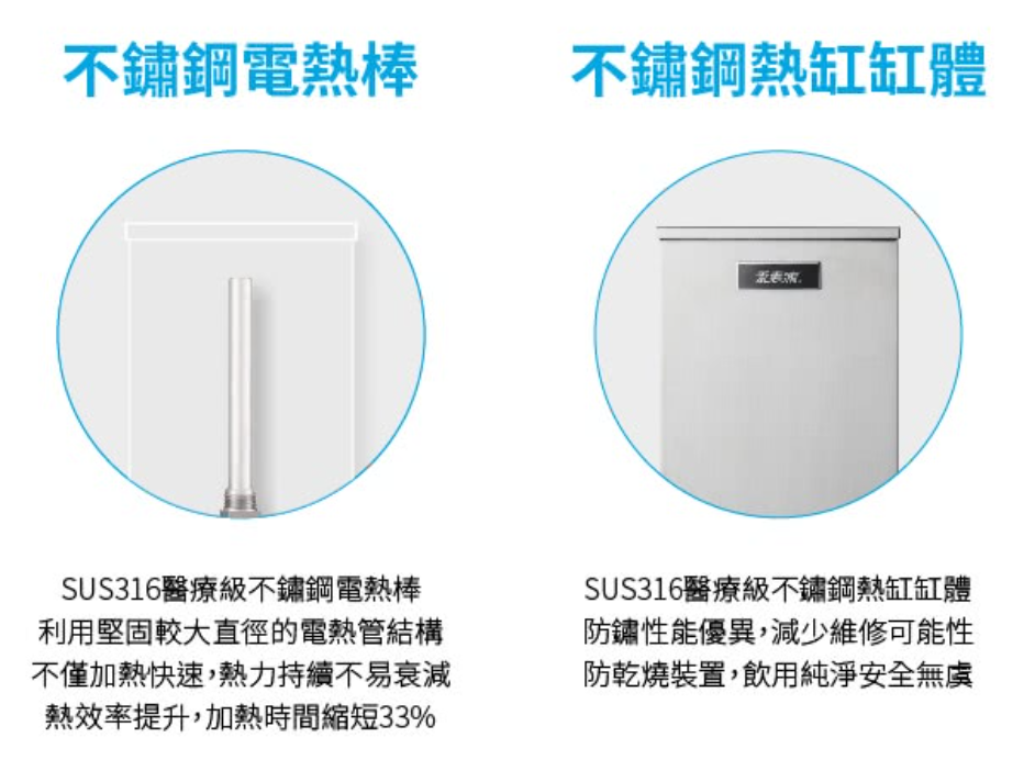 ◎ SUS316醫療級不銹鋼熱缸缸體、防鏽性能優異、減少維修可能性