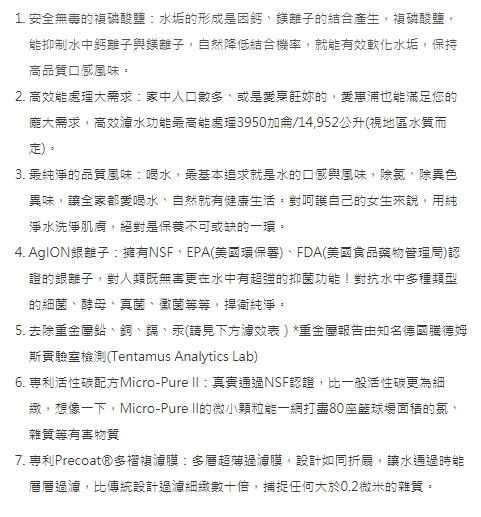 ◎0.2微米過濾力+大處理量+銀離子抑菌+軟化水垢
