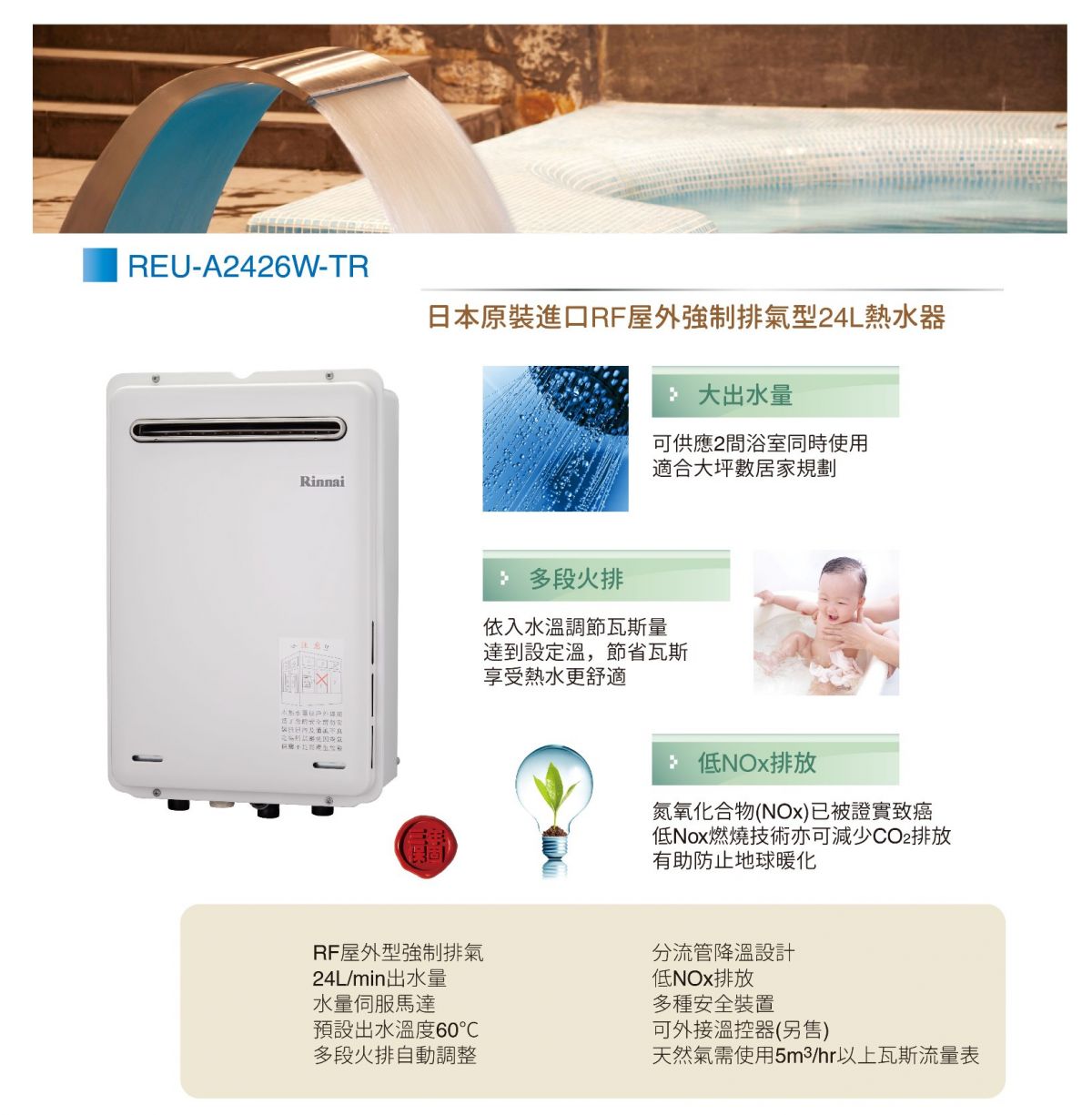 Rinnai林內-進口屋外強制排氣型24L熱水器REU-A2426W-TR