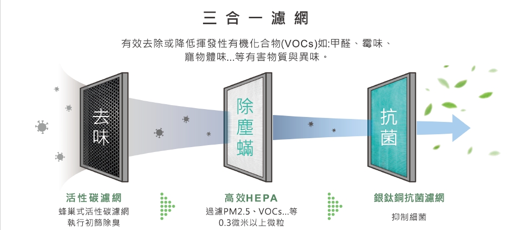 (活性碳濾網+高效HEPA+抗菌菌捕手濾網),層層潔淨,達到極佳空氣品質